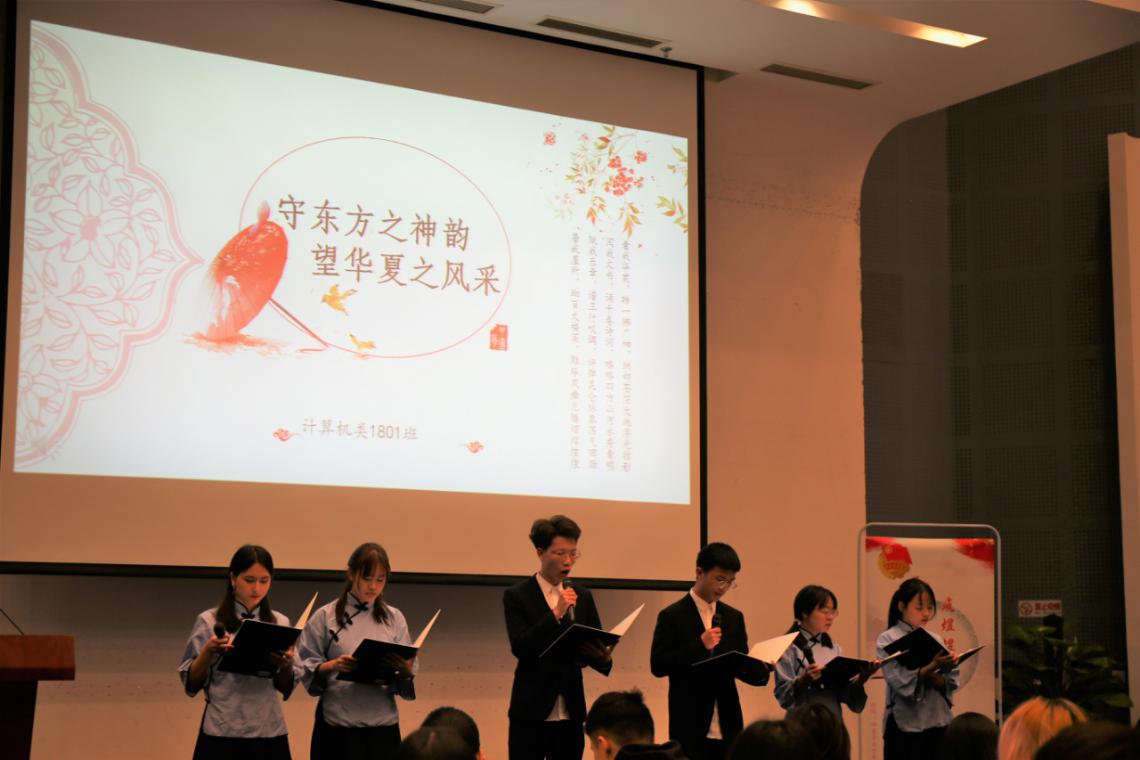 第一篇章“文化传承”,计算机1802团支部以《传盛世经典,诵华夏文明》开篇,计算机1801团支部进行题为《守东方之神韵,望华夏之风采》的朗诵,传盛世经典,颂华夏文明,展现了计算机学子对传统文化的热爱与对文化自信的坚守。