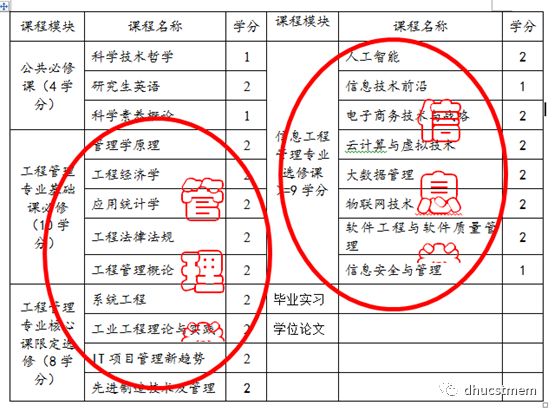 非全日制学习方式,学习年限2.5年(最长不超过5年),其中累计在校学习时间不少于1年。修满34个学分方可毕业。其中公共必修课不少于6学分、工程管理专业基础课不少于10学分、工程管理专业核心课不少于9学分、信息工程管理专业选修课不少于9学分。