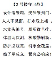 面对2号楼的紧急情况,唐老师住楼后迅速熟悉开展工作,立即摸清宿舍内学生的情况,查找工作中的BUG,梳理规范落实的工作方案,成立“护2娘子军”志愿者团队,打响2号楼守卫战,还自编了一段“2号楼守卫战”的防疫指南,带领全楼学生坚定信心稳,步调一致冲,将疫情防控落实工作抓实抓细,全楼上下全力以赴,坚决守好“责任田”,悉心护好“一栋人”。