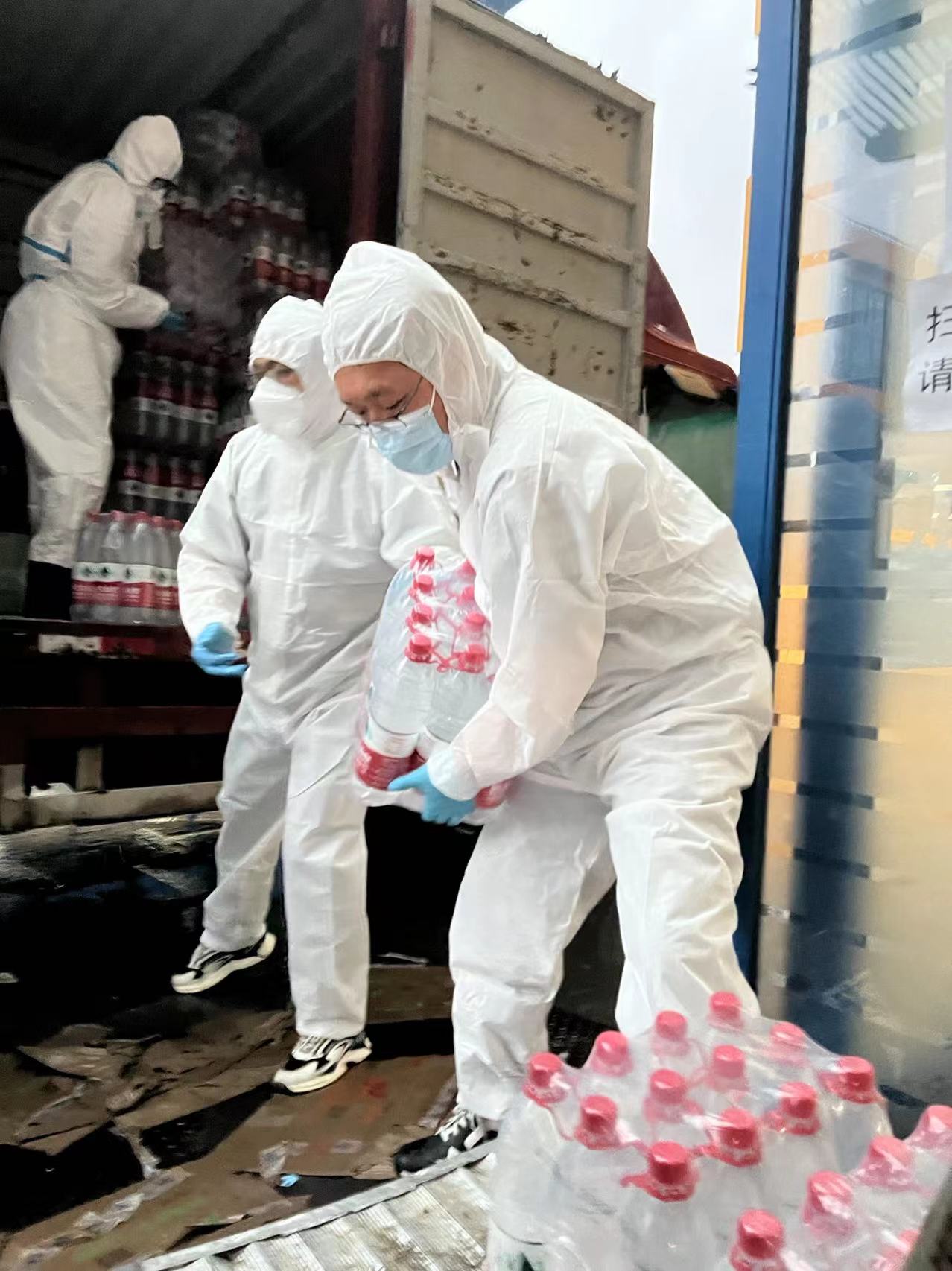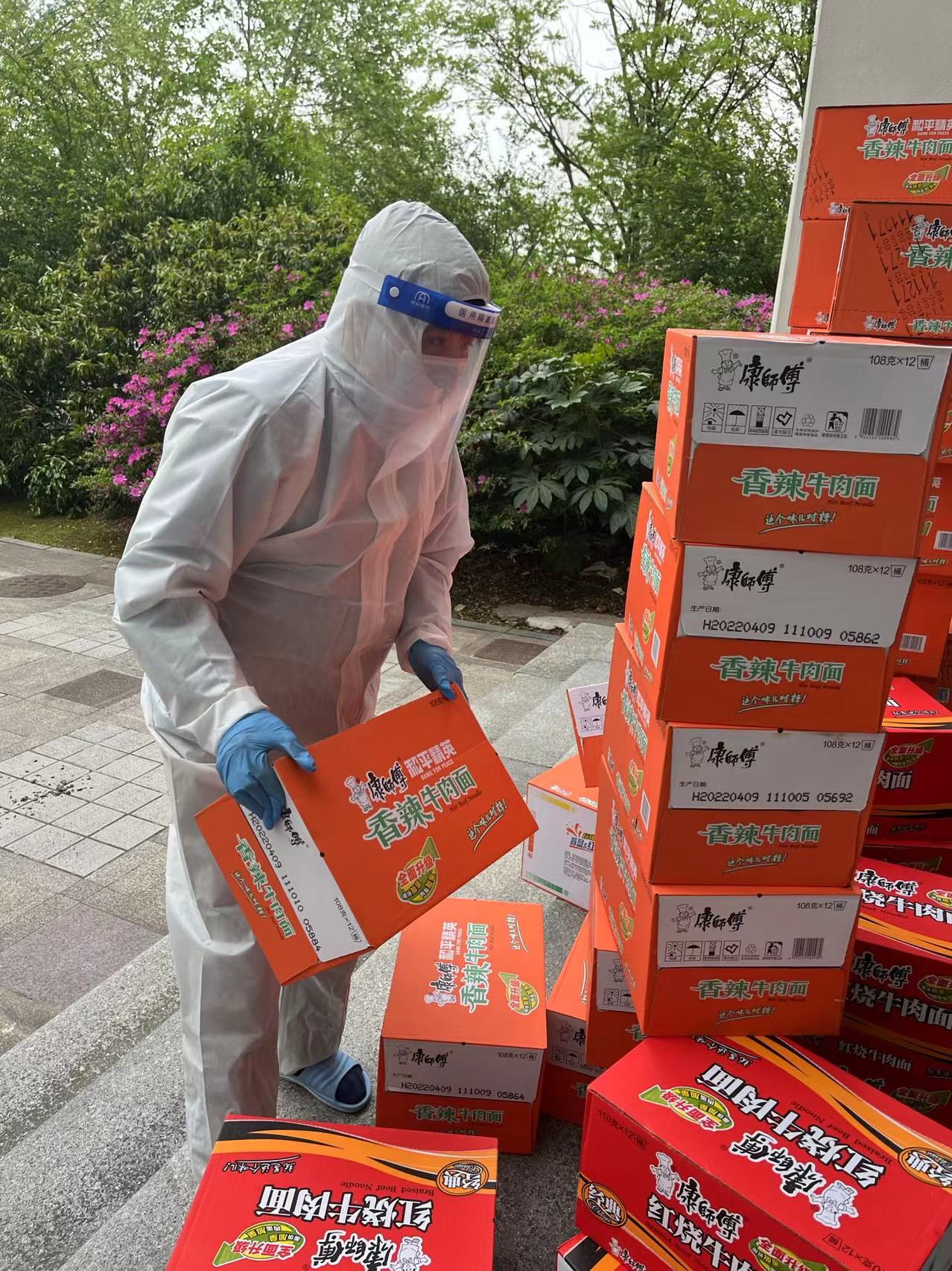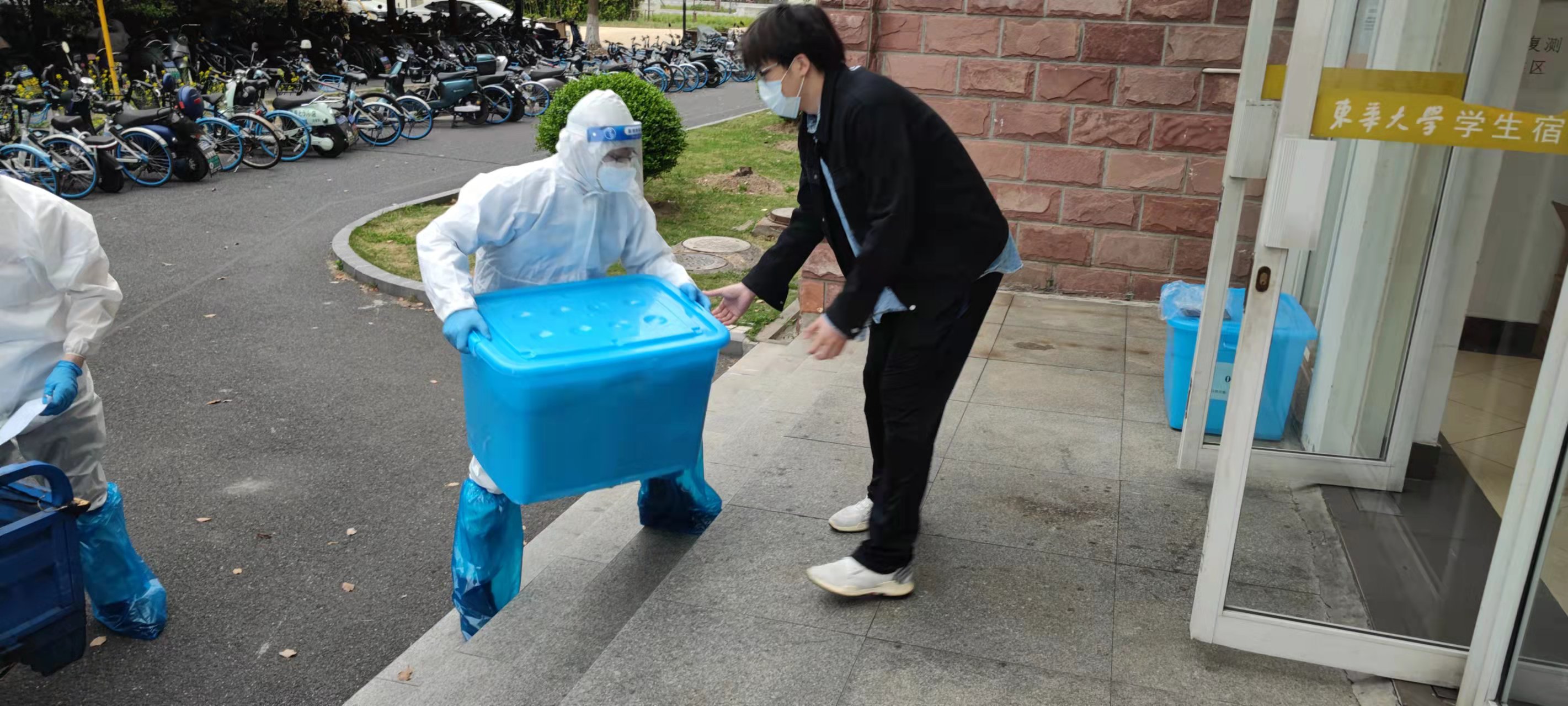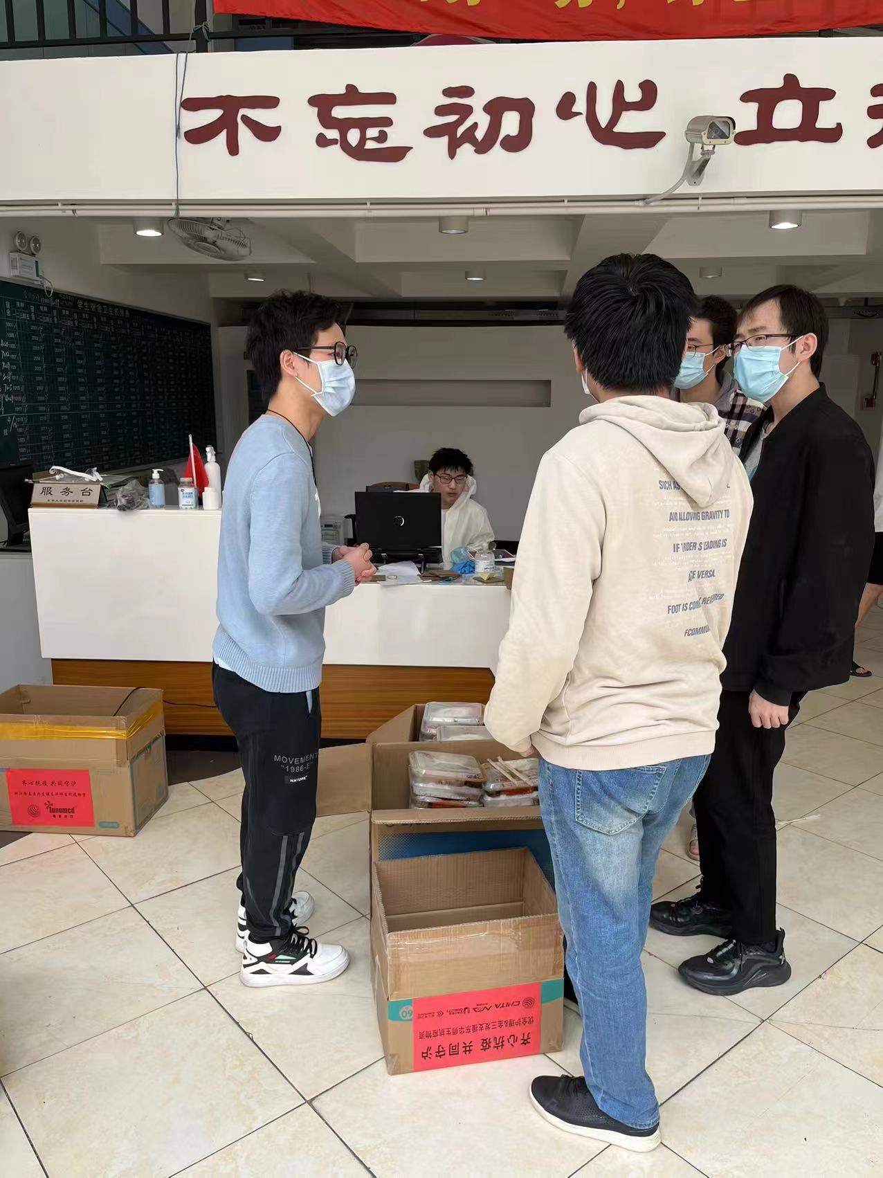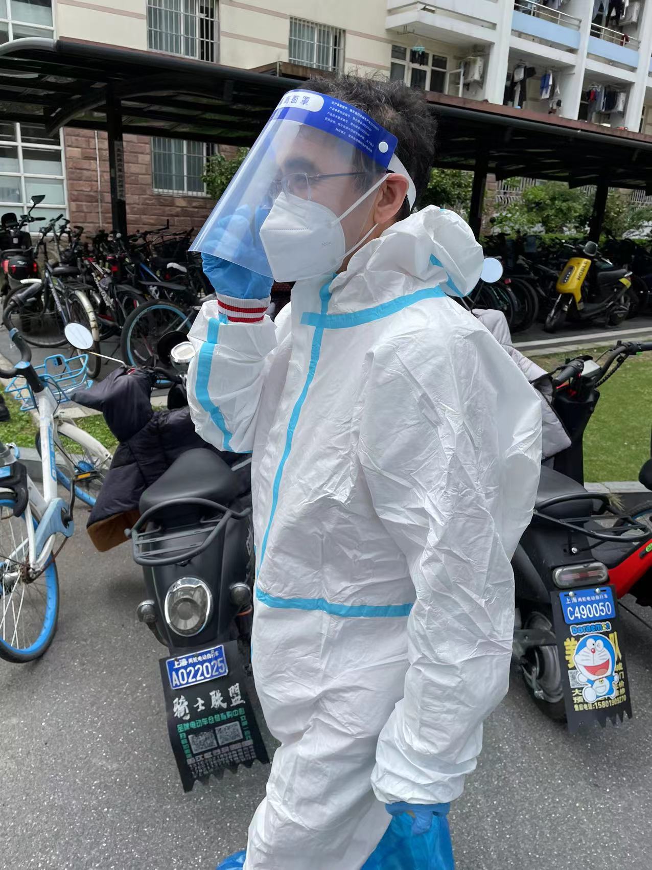 从4月4日至今,从早午晚三餐的发放到分时核酸的守卫,从一箱箱物资的传递到风雨无阻的配送,杜明老师、李锋老师和陶然老师分别是学生宿舍4号楼、27号楼和28号楼的楼外志愿者,沈雄威老师也从送餐志愿者轮岗到教育超市卸货服务志愿者。白天他们是线上的专业课老师,线下的志愿者大白,夜晚他们和衣而睡在办公室,和同学们共同守卫平安校园。