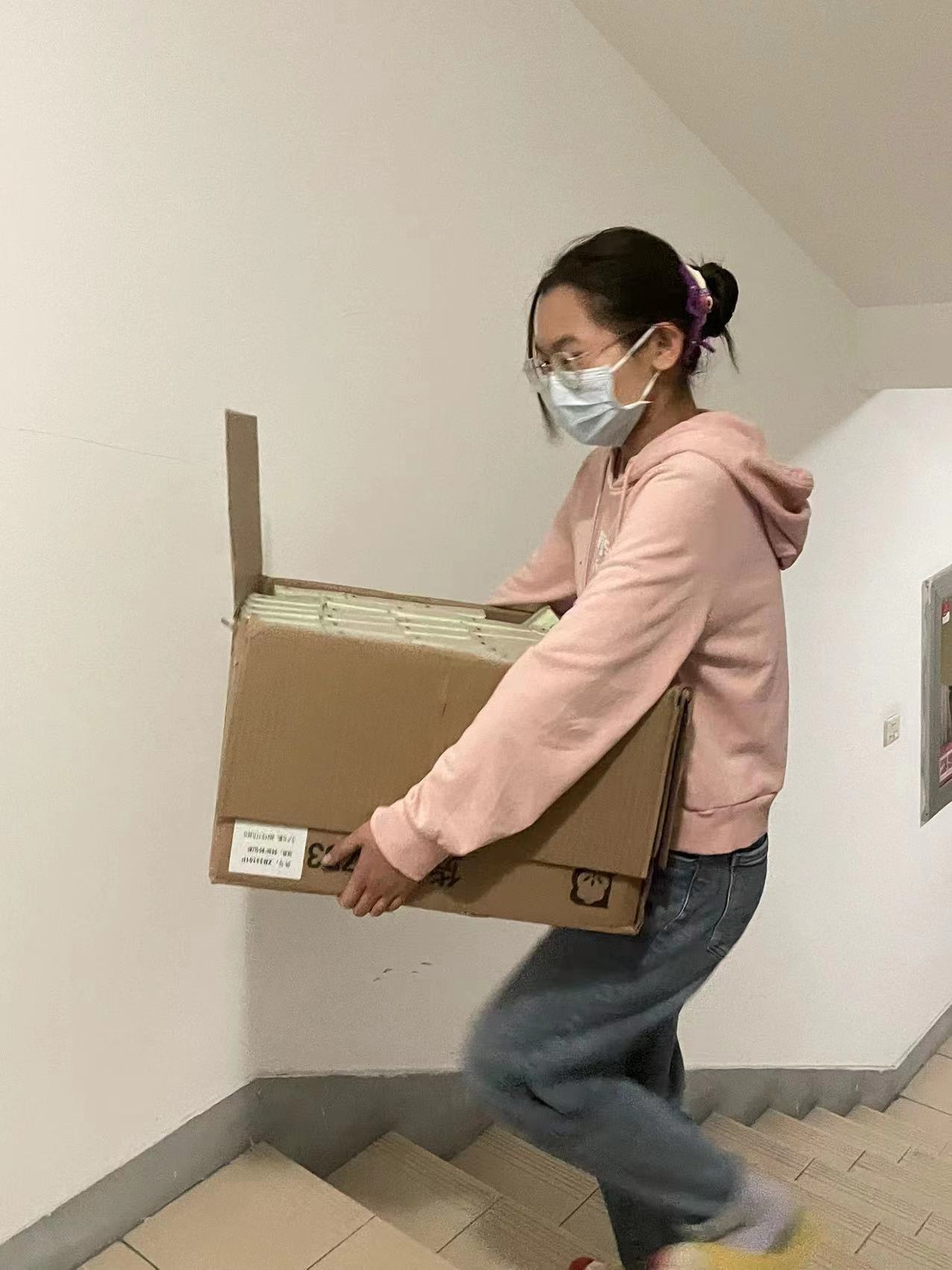 丁怡:平常主要是负责核酸,抗原统计,发物资抗原试剂,发放早中晚饭,以及传达学校的安排等事务。其实我给自己一个小小的任务就是平复大家的情绪,谁心情不好都可以找我谈心聊天。