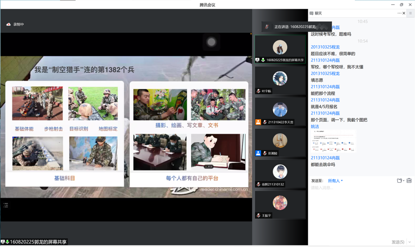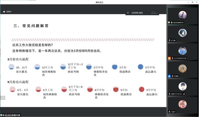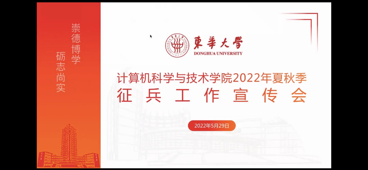 为鼓励广大学生参军入伍报效祖国,投身国防和现代化建设,东华大学计算机学院于2022年5月29日在线上召开了“携笔从戎,强国有我”2022年夏秋季征兵宣讲会。本次宣讲会由计算机学院辅导员彭湘陵老师主持,计算机学院党委副书记李华婷老师,武装部姚洁老师,学院各年级专兼职辅导员老师,以及学院所有适龄男同学们共同参加了此次宣讲会。