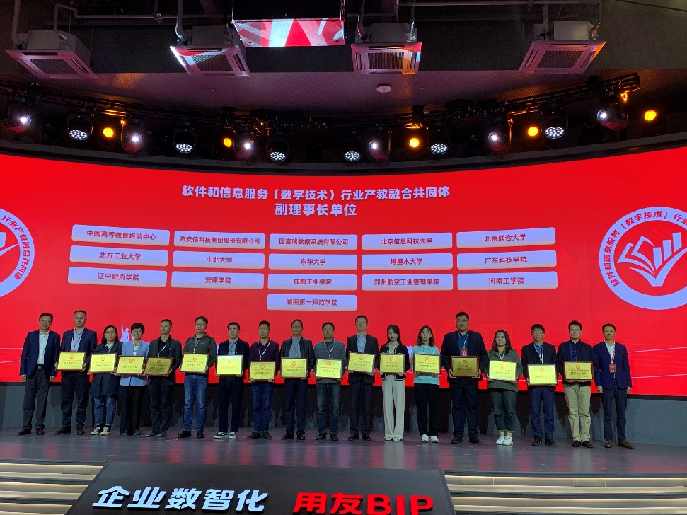 10月20日,软件和信息服务(数字技术)行业产教融合共同体(简称“共同体”)成立大会暨数字技术行业人才培养论坛在北京用友产业园举行,副校长陈革应邀参加大会,学院院长方志军、副院长石秀金等陪同。