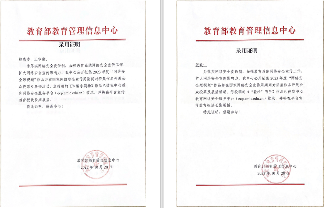 2023年4月,教育部教育管理信息中心开展网络安全短视频征集活动,经公开征集、专家评审,全国共计26部作品入围。我院计算机2001何竞凯的《网络安全小知识》、卓越软件2201顾晏彰的《安全卫士在身边》、信安2201鲍威凌和计算机2201王宇康的《诈骗小剧场》、计算机2201张政的《“轻松”陷阱》4件作品入围。前期,学院为扩大网络安全宣传影响力,广泛发动学生积极创作,并对报送作品进行专业指导,从内容结构到视频音效逐一把关,力求用鲜活素材提升网络安全意识和技能。