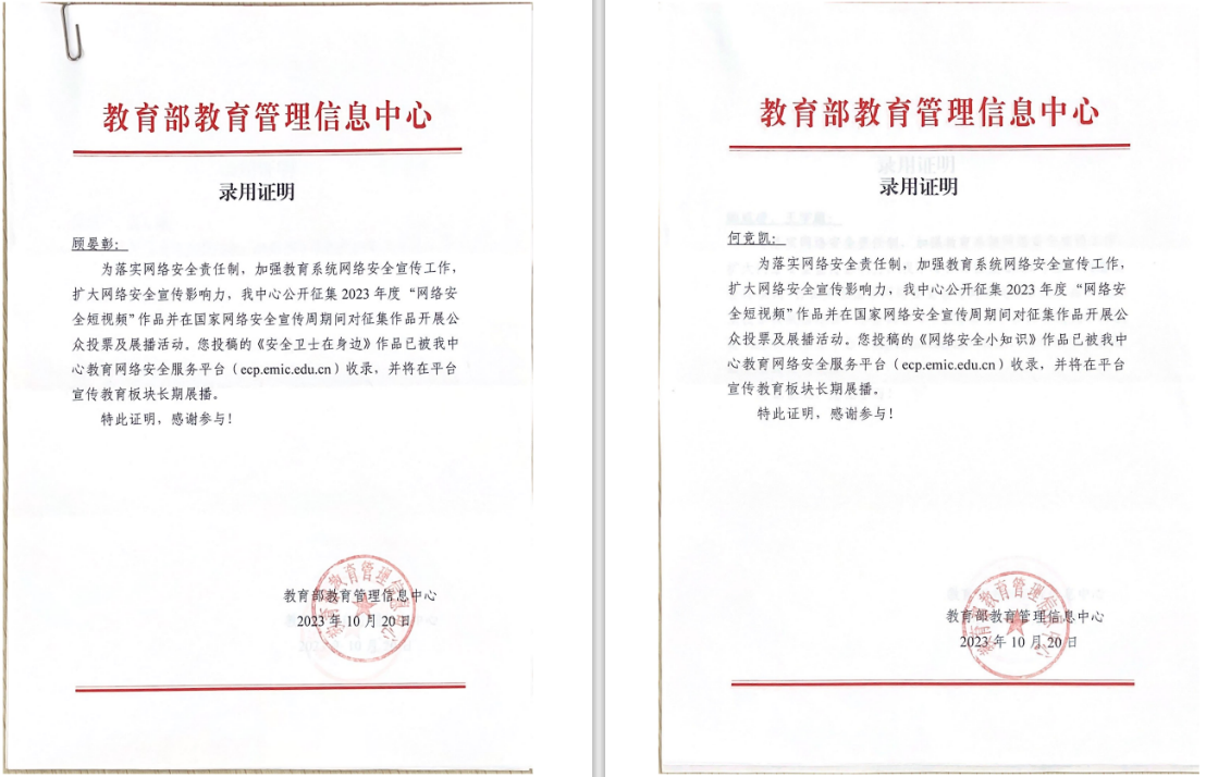 近日,教育部教育管理信息中心发来感谢信,对星空体育中国官方网站积极参加2023年度网络安全短视频征集活动表示感谢,肯定了星空体育中国官方网站选送的4部作品为开展网络安全宣传教育、提高全员网络安全意识起到的积极推动作用。在2023年度“网络安全短视频”作品公开征集及展播活动中,我院4件“网络安全短视频”作品被教育网络安全服务平台(ecp.emic.edu.cn)收录,并将在平台宣传教育板块长期展播。