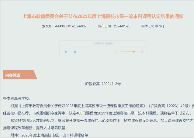 近日,上海市教育委员会发布了《上海市教育委员会关于公布2023年度上海高校市级一流本科课程认定结果的通知》(沪教委高〔20242号),我院刘晓强老师主持的“人工智能技术与应用”课程荣获2023年度上海高校市级一流本科课程认定。