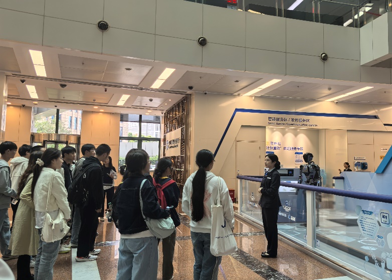 同学们走进宽敞明亮的营业大厅,大厅中央的智能机器人“小龙女”吸引了大家的注意。工作人员为同学们介绍了把智能人形机器人“小龙女”训练为银行大堂经理的背景,分享了机器人如何通过人工智能技术不断学习和优化服务的过程,让同学们了解了计算机技术在金融领域的实际应用场景。