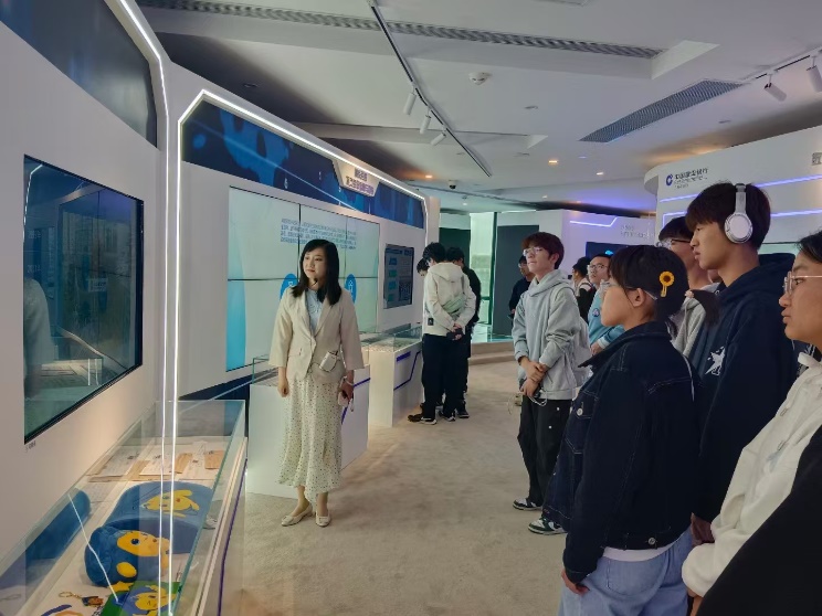 建行上海市分行人力资源部高级副经理兼培训中心主任马慧丽、人力资源部瞿頔老师带领同学们参观了行史馆,了解了中国建设银行上海市分行建行70周年以来的发展历程。馆内通过丰富的历史资料,展现了建行在不同历史时期的辉煌成就和突破。同学们也对金融行业数字化转型的背景有了更深刻的理解,激发了学生们的学习热情与动力。