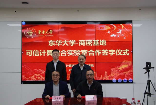 方志军院长和商用密码产业基地胡永表总经理代表双方签署了《东华大学-商密基地可信计算联合实验室合作协议》,陈革副校长与沈昌祥院士共同见证。