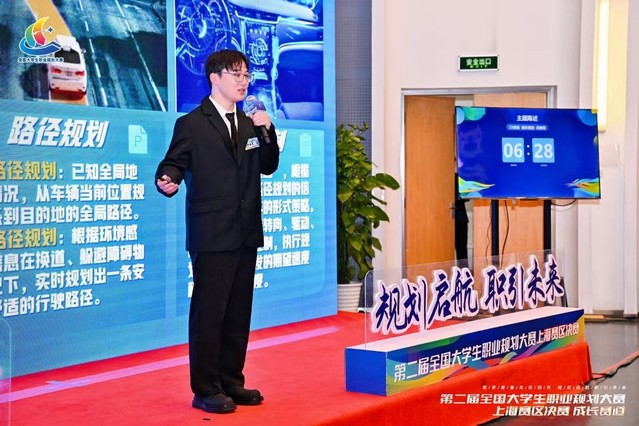 本次大赛以“筑梦青春志在四方,规划启航职引未来”为主题,由上海市教育委员会主办,自大赛启动以来,共吸引了 60所高校超过十四万名大学生踊跃参与。我院高度重视,全面发动、广泛宣传、精心组织学院选拔赛,推荐3名学生进入校赛,荣获校赛金奖1项,银奖2项,学院获评校“优秀组织奖”,唐菲菲获评“优秀指导教师”。学院将大赛与生涯规划训练营、职业体验、生涯茶话会、就业指导等活动同期统筹推进,开展种子选手培育工作,组织多场专题培训辅导和模拟实训,对选手的参赛材料打磨优化,共有5位选手进入上海市复赛,最终1人进入决赛。作为软件工程专业的学生,皮超在决赛中以“码力无限,驱动智能出行;自动驾驶,规划职业方向”为主题,展现了清晰的职业目标、一定的专业积淀和科学的生涯规划路径。