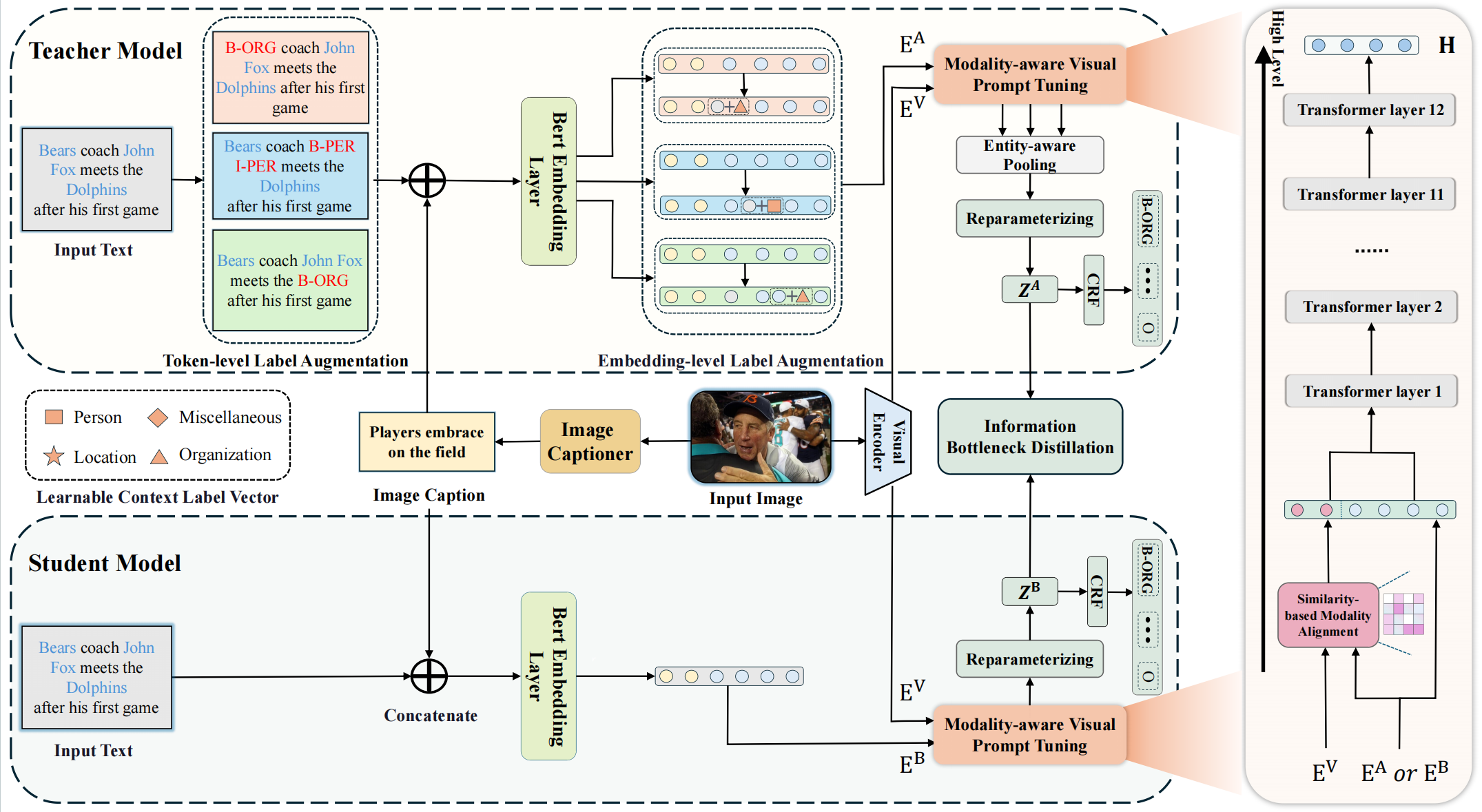 针对这一挑战,本工作提出了全新的LIBDLabel-Enhanced Information Bottleneck Distillation)框架。相较于现有方法主要依赖外部知识库或简单数据增强的做法,LIBD 首次将“标签增强”与“信息瓶颈蒸馏”相结合:其中教师模型通过双层标签增强(DLA)避免对已知实体的过拟合,学生模型则借助信息瓶颈蒸馏(IBD)精准吸收教师模型的关键信息同时抑制噪声。大量实验显示,LIBD Twitter2015 Twitter2017 两大公开数据集上整体F1 值优于当前SOTA,并在未见实体识别场景中实现显著性能提升。