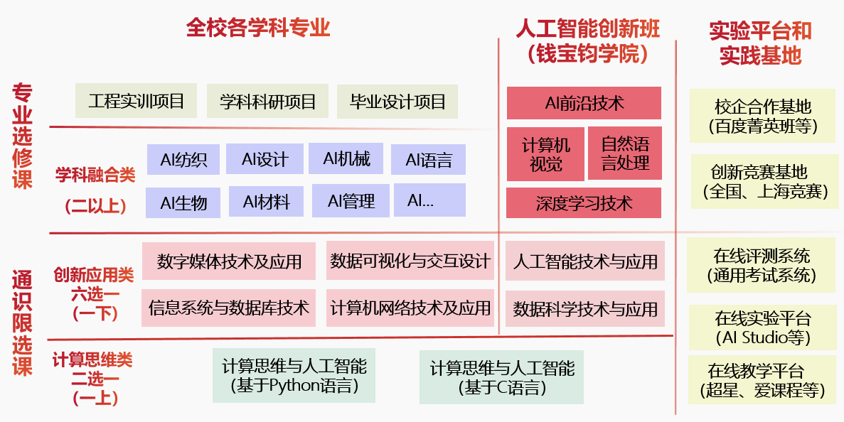 体系层面,针对计算机类专业学生,全面建设人工智能、大数据等22门相关课程,提升学生数智综合素养。针对全校学生,构建了持续AI赋能的“1+X+Y”计算机通识教育课程体系。